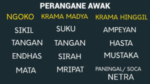 De adat (ongeschreven regel, geboorterecht, traditie) bij de Javanen schrijft voor dat men oudere mensen (dan jijzelf) e/o onbekenden niet zondermeer bij de voornaam aanspreekt. Men vindt dat zeer ongepast, en “not done” als men dit fenomeen NJANKAR hanteert. Njankar betekent zoiets als kleinerend, familiair en uit de hoogte. Ook mensen die hiërarchisch boven je staan mag je ook niet “njankar”en. Misschien vinden jongelui dat zeer ouderwets (sommige kinderen noemen hun ouders bij de voornaam), maar traditie, indien goed toegepast, heeft niets met oubolligheid te maken. Tradities zijn gebruiken en gewoonten die van de ene generatie op de andere worden doorgegeven en bij de Javaan leeft dat (gelukkig) nog steeds. Bij voorbeeld: je oom John (oudere broer van je vader) noem je Siwa John en je tante (jongere zus van je moeder) noem je Bibi (of bih). Je neef, zoon van je Siwa, noem je Kang(kakang), enz. Ook oudere mensen noem je Pak(bapak) of Mbah en ‘Bu(ibu) of Mbah. Zekerheidshalve spreek je een onbekende man aan met Kang (kakang, indien hij er ietsje ouder uitziet dan jij), Mang(paman, indien hij jonger lijkt dan je vader), Wa(Siwa, indien hij/zij ouder lijkt dan je vader) of Pak(bapak, indien hij er oud uitziet). Pak/’Bu of Mbah is de algemene beleefdheidsvorm als je oudere mensen aanspreekt, maar duidt ook je respect aan tegenover de man of vrouw. Ook spreekt men oudere mensen vaak in het derde persoon enkelvoud aan. Het woord sampéyan betekent nl. niet alleen U, maar is een krama-woord voor voet. Dus als je bv Mbah Dipo vraagt waar hij heen gaat zeg je ook: Mbah Dipo ajeng teng pundi? Ipv Sampéyan ajeng ing pundi, mBah?