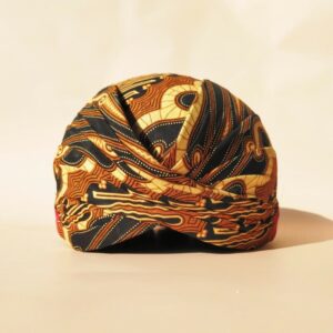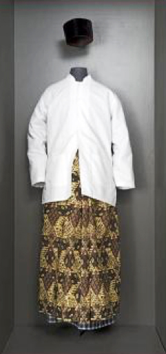 Als hoofddeksel draagt hij een songkok (peci), blangkon.